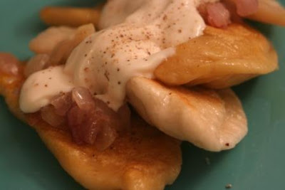 6. Drain cooked pierogies. Saute them in margarine over medium heat, about 3-4 mins per side, until a nice golden brown. Top with sauteed onions, vegan sour cream, and freshly ground pepper.