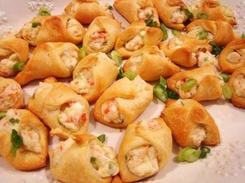 6. Spoon 1 teaspoon crab mixture 1/2 inch from 1 corner of 1 square. Starting with same corner, working diagonally, fold dough over filling, and tuck end tightly underneath filling; continue rolling to within 1/2 inch of opposite corner.
