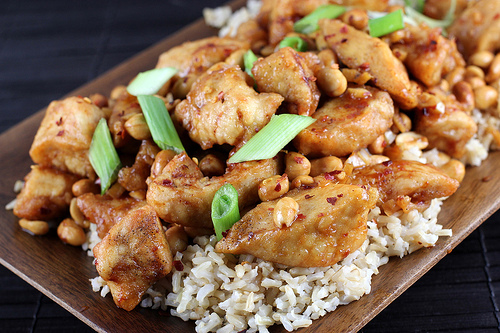 In a serving bowl mix cooked chicken pieces with the sauce. Add green onions and peanuts. Mix well and serve. Makes 2 Servings