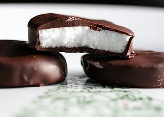 Make filling: Beat 2 1/4 cups confectioners sugar with corn syrup, water, peppermint extract, shortening, and a pinch of salt using an electric mixer (with paddle attachment if using a stand mixer) at medium speed until just combined. Knead on a work surface dusted with remaining 1/4 cup confectioners sugar until smooth. Roll out between sheets of parchment paper on a large baking sheet into a 7- to 8-inch round (less than 1/4 inch thick). Freeze until firm, about 15 minutes. Remove top sheet of paper and sprinkle round with confectioners sugar. Replace top sheet, then flip round over and repeat sprinkling on other side. Cut out as many rounds as possible with cutter, transferring to a parchment-lined baking sheet. Freeze until firm, at least 10 minutes. Meanwhile, gather scraps, reroll, and freeze, then cut out more rounds, freezing them. Temper chocolate and coat filling: Melt three fourths of chocolate in a metal bowl set over a saucepan of barely simmering water. Remove bowl from pan and add remaining chocolate, stirring until smooth. Cool until thermometer inserted at least 1/2 inch into chocolate registers 80°F. Return water in pan to a boil and remove from heat. Set bowl with cooled chocolate over pan and reheat, stirring, until thermometer registers 88 to 91°F. Remove bowl from pan. Balance 1 peppermint round on a fork and submerge in melted chocolate, letting excess drip off and scraping back of fork against rim of bowl if necessary, then return patty to sheet (to make decorative ridges on patty, immediately set bottom of fork briefly on top of patty, then lift fork straight up). Coat remaining rounds, rewarming chocolate to 88 to 91°F as necessary. Let patties stand until chocolate is set, about 1 hour.