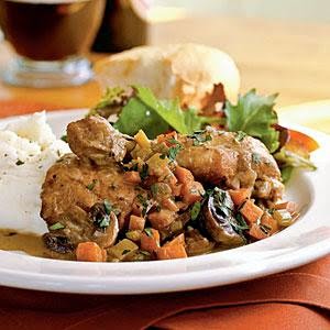 2. Add celery, carrot, shallots, and juniper berries to pan; sauté 5 minutes or until vegetables are tender, stirring occasionally. Add mushrooms. Place thyme, parsley, and bay leaf on a double layer of cheesecloth. Gather edges of cheesecloth together; tie securely. Add cheesecloth bag to pan. Return chicken to pan, nestling into vegetable mixture. Stir in beer; bring to a simmer. Cover, reduce heat, and simmer 45 minutes or until a thermometer inserted in the meaty parts of chicken registers 160°. (Breasts may cook more quickly. Check them after 35 minutes, and remove them when they're done; keep warm.)