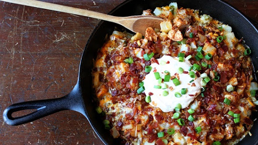 Spread half of the potatoes on bottom of skillet. In small bowl, toss chicken with 1/2 cup of the cooking sauce; spoon chicken over potatoes. Sprinkle half each of the bacon, green onions and cheese over chicken. Spread remaining potatoes on top; sprinkle with remaining cheese and bacon. Cover skillet tightly with foil.
