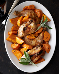 Heat the oven to 450°. Coat the chicken quarters with 1 tablespoon of the oil, 1/2 teaspoon of the salt, and 1/8 teaspoon of the pepper. Arrange the chicken quarters, skin-side up, in a large roasting pan. Toss the cubes of butternut squash with the remaining 2 tablespoons of oil, 1/4 teaspoon of salt, and 1/8 teaspoon of pepper, and the sage. Add the cubes of squash to the roasting pan.