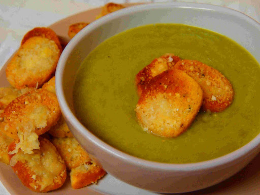 Heat olive oil in a heavy based pot, fry onion and garlic till translucent. Add stock, potatoes, peas and salt & pepper.