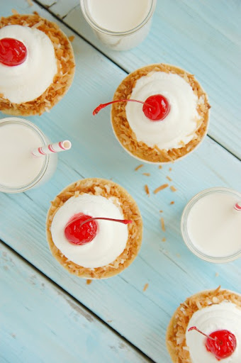 Coat the sides of the whipped cream with toasted coconut and top with a maraschino cherry.