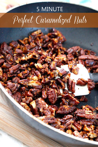1.Heat a medium non-stick skillet over medium heat and add nuts, sugar, butter and cinnamon. Stir constantly with a rubber heat-proof spatula for approximately 5 minutes (less time if your nuts are chopped as pictured) until the nuts are evenly coated in the melted sugar/butter.