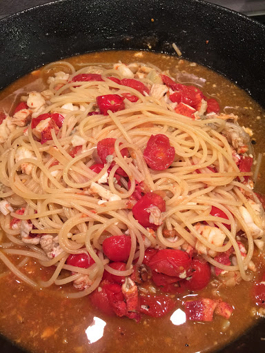 Add lobster meat to skillet and toss to coat. Add pasta and 1/2 cup reserved pasta cooking liquid; season with salt and pepper.