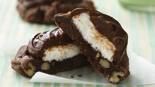 Bake 7 minutes. Remove from oven; immediately press marshmallow half lightly, cut side down, on top of cookie. Bake 1 to 2 minutes longer or just until marshmallows begin to soften. Cool 2 minutes; remove from cookie sheets to cooling racks. Cool completely, about 15 minutes.