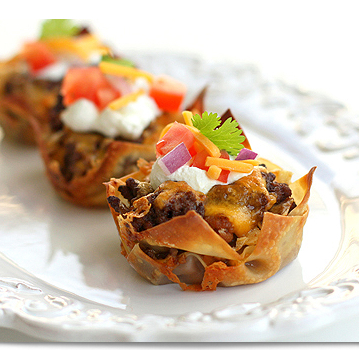 Place one wonton wrapper in the bottom of each muffin cup. Layer about 1 Tbsp of refried beans on top of each wonton. Crush one tortilla chip on top of the beans. Top with 1 Tbsp of taco meat and 1 Tbsp of shredded cheese. Repeat the layers again with a wonton wrapper, refried beans, tortilla chips, taco meat, and cheese.