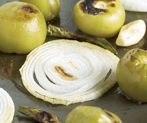 Position a rack as close to the broiler as possible and heat the broiler. Arrange the tomatillos, fresh chiles (if using), onion slices, and garlic in a small, shallow baking pan. Broil, turning to ensure even cooking, until the tomatillos are soft and slightly blackened, about 10 minutes. Transfer the broiled ingredients to a blender and add the cilantro (if you’re using a canned chipotle, add it now, too). Blend until smooth.