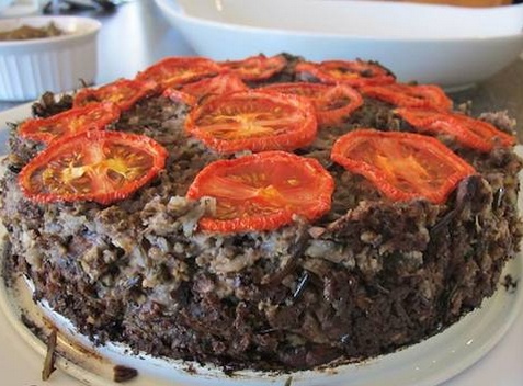 Press the mixture firmly into the prepared springform pan, and attractively arrange the tomato slices over the top, covering most of the surface. Bake uncovered for 1 hour. Allow the torte to stand for 15 to 20 minutes before removing from the pan. Cut into wedges to serve.