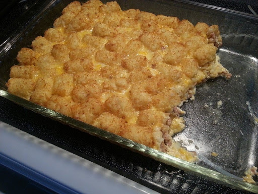 Preheat oven to 350. In a 9x13 pan layer the sausage first, then cheese. Pour egg mixture over meat and cheese. Cover pan with Tater Tot layer.