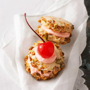 6.Spread about 1 teaspoon of the remaining filling on the bottom of each of half of the cookies. Top with remaining cookies, flat sides down, pressing lightly together. Before serving, spoon a small amount of the reserved filling on top of each assembled sandwich cookie. If desired, press a maraschino cherry into filling. Makes about 21 sandwich cookies.