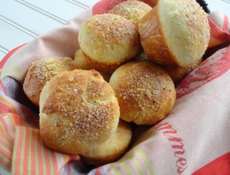 3. Divide dough into 12 equal balls. Flatten each ball into a circle, approximately 3-4" across. Place a mozzarella chunk in the middle and close up, pinching dough together to seal. Place in a well-greased muffin pan or on cookie sheet at least 1" apart, and put in warm place until doubled in size, about 1/2 hour to 45 minutes.