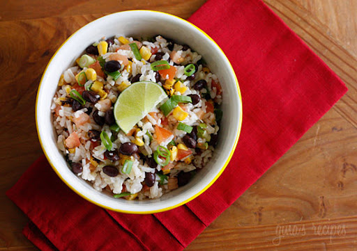 In a large bowl, combine hot rice, heated corn, heated beans, (corn and beans warmed in microwave) tomato, scallion, cilantro, lime juice and salt if needed. Toss and serve.