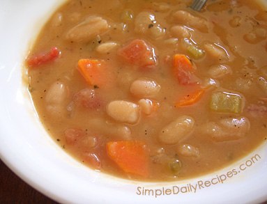 Add beans, hambone, onion, celery, garlic, bay leaf, spices, tomatoes etc. Simmer and skim off excess fat and foam that comes to the top. Cook until beans are soft enough to flatten with spoon against side of pot. Add carrots last and check for doneness. (I add ditalini pasta about 2 hands full) and let cook at a simmer until done.