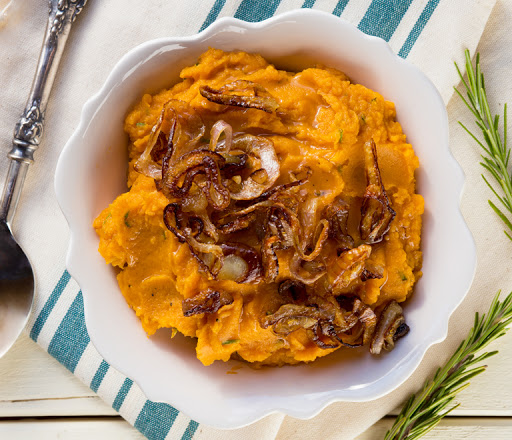 Place the sweet potatoes in a large bowl. Beat with a mixer at medium speed until smooth. Add the rosemary, salt, pepper, and stevia. Beat until blended. Spoon into a bowl. Top with the shallots and drizzle with the remaining 1 1/2 teaspoons of olive oil.