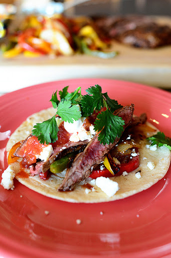 In a dish, mix together olive oil, Worcestershire, lime juice, garlic, cumin, chili powder, red pepper flakes, salt, pepper, and sugar until combined. Pour half of the marinade into a separate dish. In one dish, place the flank steak, turning it over to coat. In the second dish, place all the veggies, turning to coat. Cover the dishes with plastic wrap and place in the fridge for at least 2 hours.