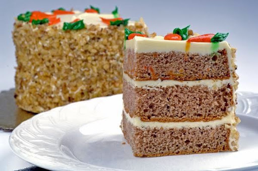 Grease 2 (10-inch) cake pans and set aside. Mix together in a large bowl the oil, sugar, eggs, carrots, nuts, pineapple, coconut and raisins. In another bowl, sift together the flour, baking soda, baking powder, cinnamon and salt. Add the carrot mixture and blend. Pour the batter into the cake pans and bake in a preheated 350 degree F oven for 35 to 40 minutes or until done. Remove from oven and cool for 30 minutes. Release the cakes from the pans and cool completely before cutting and frosting. Cut cakes in 3 equal layers (a total of 6 layers). Assemble the carrot cake one layer at a time. Finish the carrot cake with a layer of cream cheese frosting on top. Do not frost the side of the cake. This gives the cake that special homemade country-style look. Garnish with toasted walnuts and coconuts.