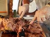 Remove Boston butt from brine and pat dry. Sift the rub evenly over the shoulder and then pat onto the meat making sure as much of the rub as possible adheres. More rub will adhere to the meat if you are wearing latex gloves during the application.