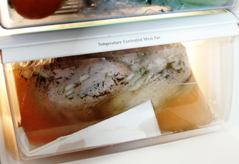 I slowly poured the brine into the bag and tied a loose knot.I carefully transferred the turkey to the (cleaned and sanitized) meat drawer from the refrigerator with the knot facing upwards. I marinated the turkey for 1 day before turning the turkey over so the top side was bottom, and the bottom was top. This way both halves of the turkey had ample time to marinate. I basted the upper side of the turkey once during the process.