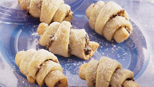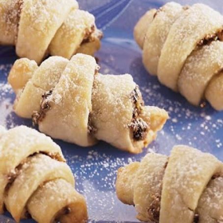 On floured surface with floured rolling pin, roll out 1 disk of dough at a time to 1/8-inch thickness, forming 12-inch round. (Keep remaining disks of dough refrigerated.) Sprinkle 1/4 of date-nut mixture onto round; press into dough slightly. Cut round into 16 wedges. Roll up each wedge from curved edge to point. Place on greased cookie sheets.