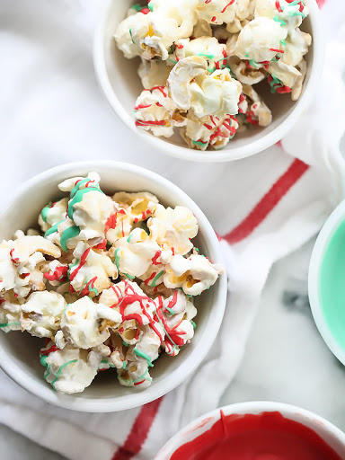 Once the popcorn is completely dry, use a fork to scoop a bit of the red chocolate and drizzle it over the popcorn n streaks. Let the chocolate dry and then repeat with the green chocolate. Allow chocolate to dry between colors.