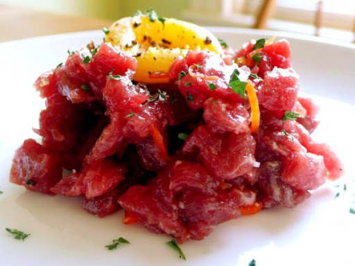 Serve tartare on a large plate, garnished with mint and pickles, with basket of ciabatta toast and bowl of dressed watercress.
