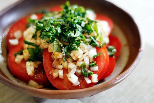Remove the stem from the tomato and slice 3/8″ thick. Finely chop the onion and shiso and place in separate bowls of water and let soak for 5 minutes.