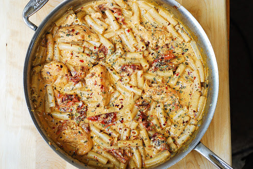Slice sun-dried tomatoes into smaller bits and add them back to the skillet with chicken. Add half and half and cheese to the skillet, too, and bring to a gentle boil. Immediately reduce to simmer and cook, constantly stirring, until all cheese melts and creamy sauce forms. If the sauce is too thick - don't worry - you'll be adding some cooked pasta water soon. Add cooked pasta to the skillet with the creamy sauce, and stir to combine. Add 1 tablespoon of basil, and at least 1/4 teaspoon of red pepper flakes. Stir to combine.