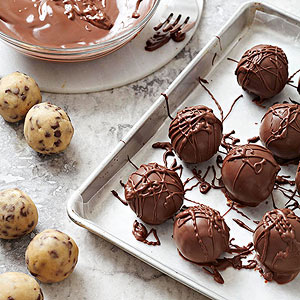 Line a baking sheet with waxed paper. Using a fork, dip balls into chocolate mixture, allowing excess chocolate mixture to drip back into saucepan. Place dipped balls on the baking sheet. Let stand or chill about 30 minutes or until set. Lightly drizzle with the remaining melted chocolate mixture.