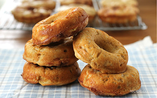 Spoon batter into a greased doughnut pan, filling each almost full.