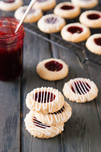 Place each coconut rolled dough ball 1½" apart on prepared baking sheets. Flatten each dough ball slightly and press the center of each ball down with your thumb to make a small well. Place about ½ t. of jam in each well.
