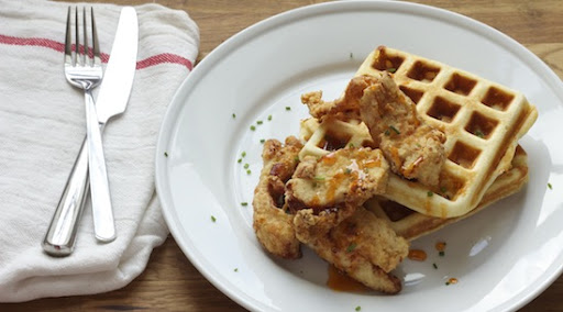 6. Serve the waffles with a few pieces of fried chicken on top. Drizzle with the hot honey and sprinkle with additional chopped chives.