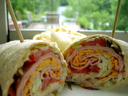 Place the 4 sandwich wraps on 4 plates. Spread some of the coleslaw mix on the wrap. (You’ll end up with extra coleslaw.) Place 2 slices of ham on each. Top with the tomato and shredded cheese, and sprinkle with salt and pepper. Wrap tightly, slice on the diagonal, and pierce each half sandwich with a wooden skewer. Serve with your favorite potato chips or fresh fruit.