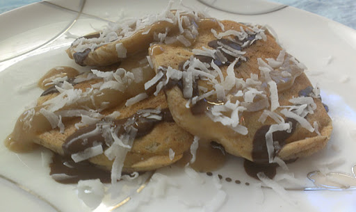 Drizzle each serving with date caramel sauce, stevia chocolate syrup and sprinkle with coconut. I don't need any extra maple syrup on these pancakes, but you can certainly serve some on the side if you want to.