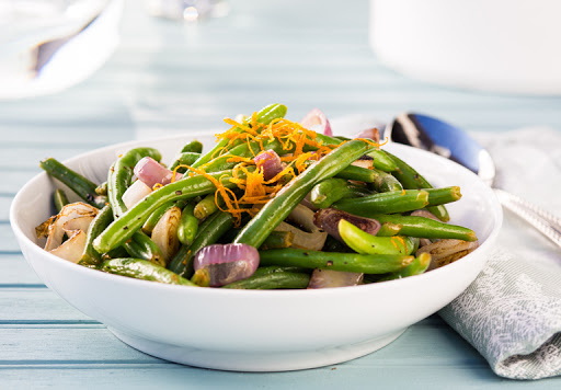 Heat a large nonstick skillet over medium-high heat. Add the oil and shallots, sauté 2 minutes or until tender. Stir in the green beans. Add 1 teaspoon orange zest, lemon juice, pepper, and salt. Sauté 2 minutes. Spoon into a serving dish and garnish with more orange zest.