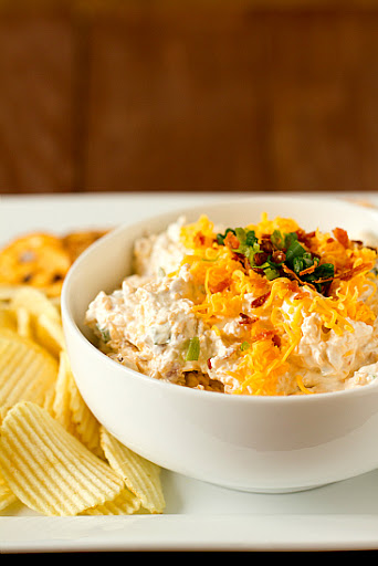 Combine all ingredients in a medium bowl and refrigerate for at least one hour before serving to allow flavors to meld together. Garnish with extra shredded cheese, crumbled bacon, and chopped chives. Serve with your favorite potato chips or pretzel crisps. Dip can be stored in an airtight container in the refrigerator for up to 1 week.