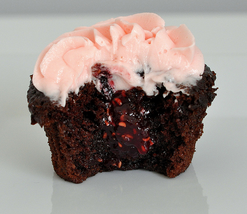 Using a Bismark tip and pastry bag, insert the tip almost all the way through to the bottom of the cupcake and as you pull the tip out squeeze.