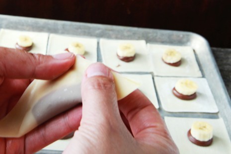 Make an assembly line with the Nutella, bananas, and egg wash. Place about 1 teaspoon of Nutella in the center of a wonton wrapper then put a banana on top. Wet all four edges of the wrapper with the egg wash and seal into a triangle shape.