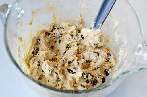 3. Cream butter, brown sugar and granulated sugar in a large mixing bowl until light and fluffy (use mixer). Add vanilla and egg. Beat well. Add in flour mixture slowly until blended. Stir in chocolate chips.