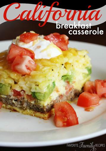 In a bowl, beat eggs and milk. Stir in all other ingredients. Pour hash and egg mixture over the sausage, tomatoes, and avocados.
