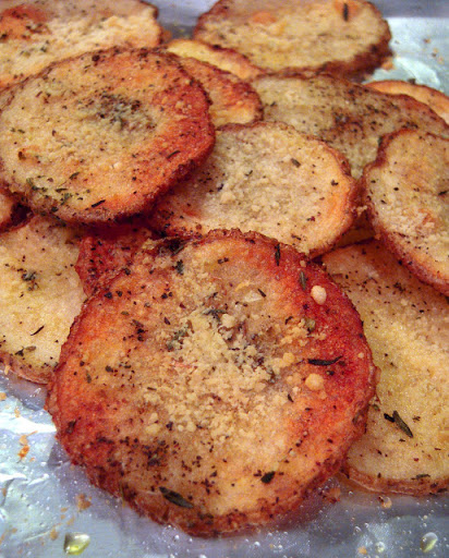 Slice potatoes into very thin slices (1/4 inch). big ziploc bag to coat the potatoes. Toss potatoes with olive oil, Italian seasoning and salt in a ziplock bag to coat. Place in a single layer on a baking sheet lined with foil. Bake at 450 for 15 -20 minutes, until lightly brown. Top with Parmesan cheese and bake an additional 5 minutes.