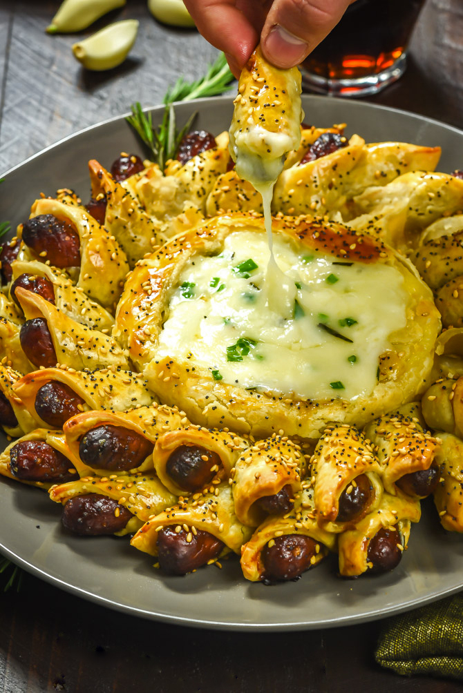Cut even-sized strips all around the brie, like a sun, making about 18 cuts in total. Place one cocktail sausage at the outer leftmost corner of one of the strips at a slight angle. Roll it inward to wrap in the pie dough and press the edges to seal. Continue all the way around until the first layer of strips are all wrapped around cocktail sausages. You may have to move the wrapped sausages gently in the process in order to fit others– that’s okay.