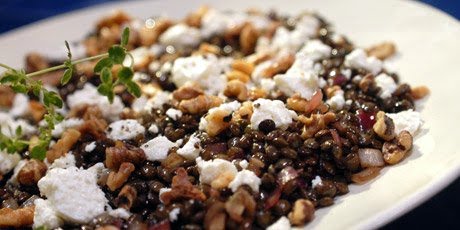 Meanwhile, heat the olive oil in a sauté pan and fry the onion until soft. Add the garlic for one minute, then deglaze the pan with a splash of balsamic vinegar. When the lentils are cooked, toss them with the onion, son with salt and pepper and put them in a serving dish. Scatter over the nuts and pinches of cheese. Serve warm with roasted beetroot.