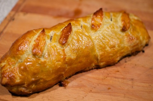 Beef Wellington can seem a bit daunting at first, but it’s really not that difficult. It all starts with the whole tenderloin, trimmed and tied, with the thinner end doubled to make the whole tenderloin a more uniform shape.