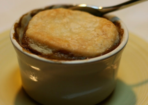 5. Roll out puff pastry to about 1/2" thick and cut into circles to fit the top of the ramekin (use the leftovers to make turnovers). Top each pot pie with the pastry, then bake for 20-25 mins, or until pastry is golden and gravy is bubbling.