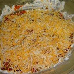 Mix guacamole dip and sour cream together and then spread over picante sauce.