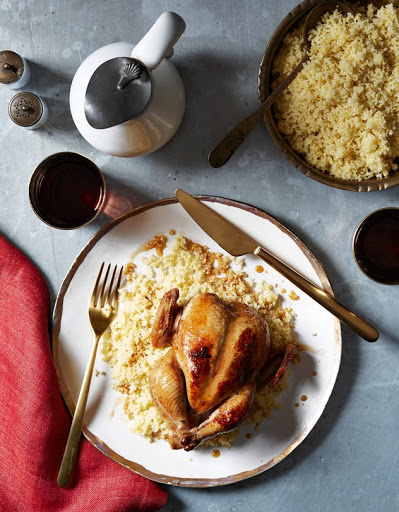 Meanwhile, in a bowl, toss hot couscous with melted butter. Lightly season with salt. To serve, place each hen atop a mound of hot couscous. Drizzle with any remaining glaze.