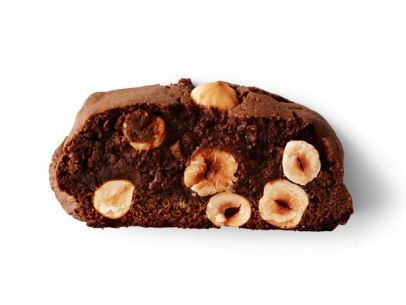 Preheat the oven to 350°F. Line a baking sheet with parchment paper. Whisk the flour, cocoa powder, espresso powder, baking powder, baking soda and salt in a medium bowl. Beat the butter and sugar in a large bowl with a mixer on medium-high speed until light and fluffy, 3 to 5 minutes. Beat in the eggs one at a time, then beat in the vanilla. Reduce the mixer speed to low; add the flour mixture and beat until just incorporated, then beat in the hazelnuts.